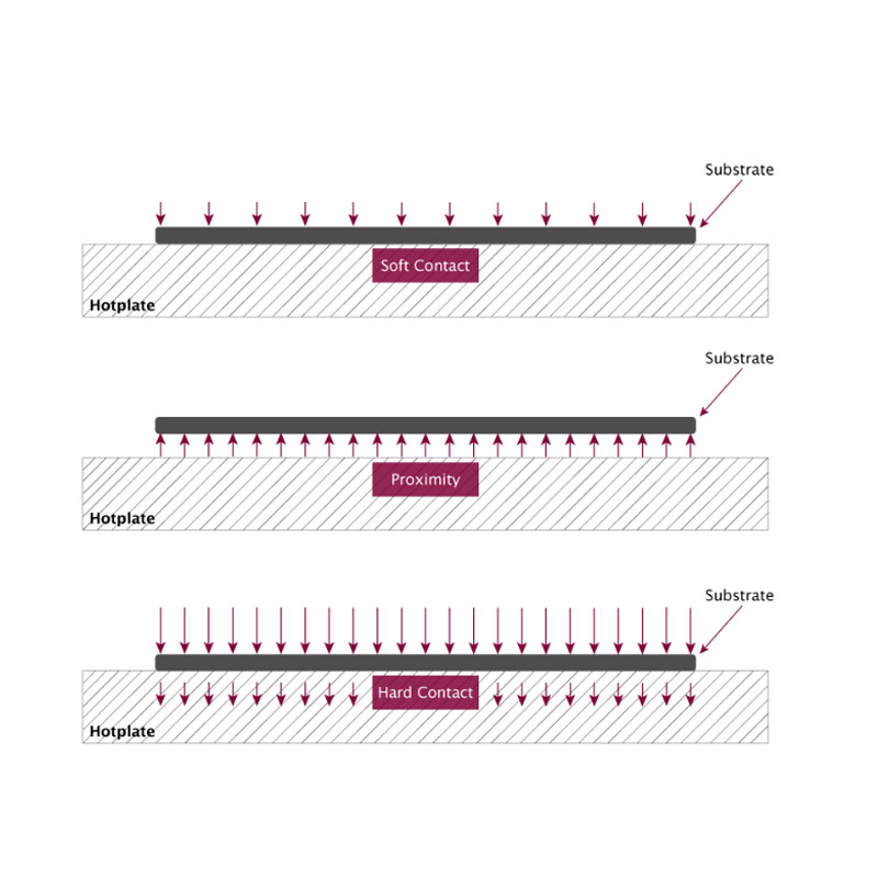 Three bake styles exist Hot Plates: proximity bake, soft contact bake and hard contact bake. These may be used in combination to further refine your baking process. The following section will discuss these methods and the advantages of each.