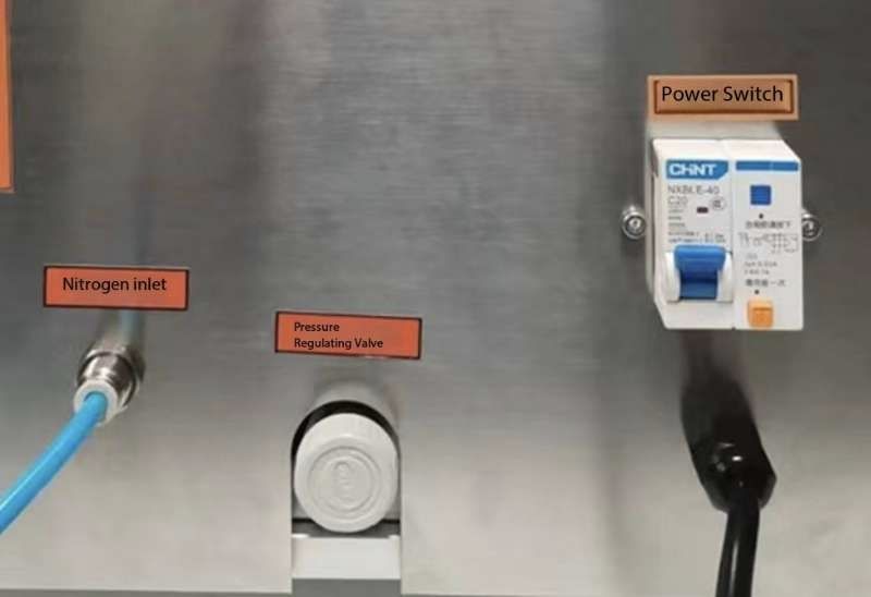 1. Confirm the equipment’s inlet valve “Nitrogen Switch,” outlet valve “Exhaust Switch,” and “Vacuum Switch” are in the closed position.